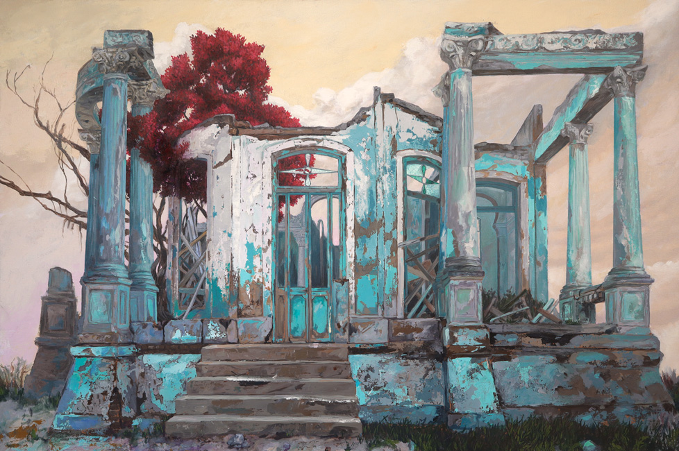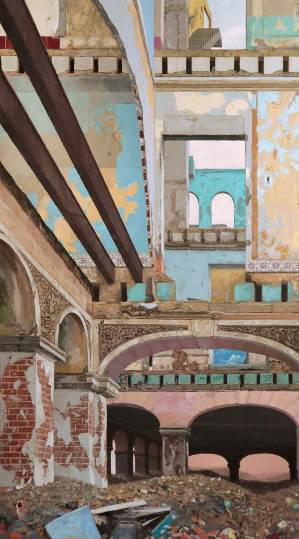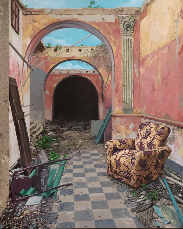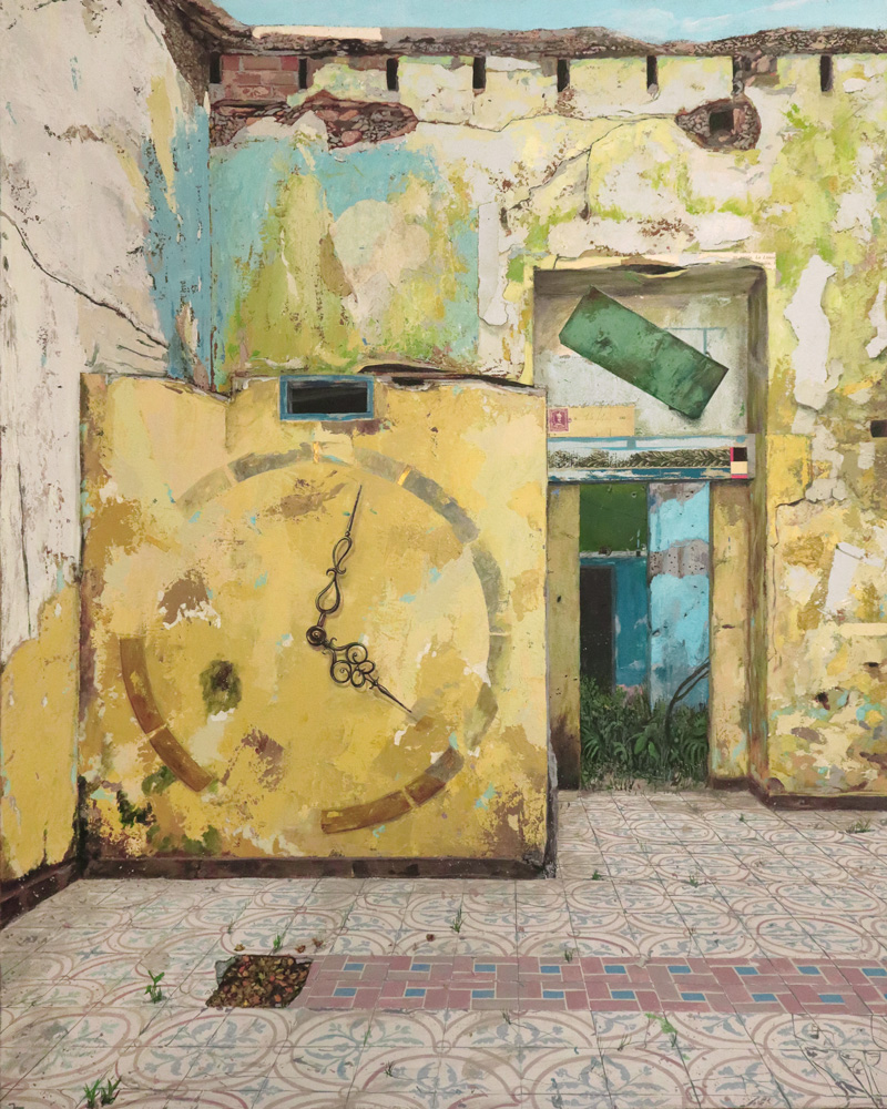 Serie de pinturas que representan las infinitas yuxtaposiciones de capas de tiempo sucedidas en los espacios habitados, arrasados y de nuevo habitados, en un constante ciclo de uso y desuso, que termina por formar una trenza de pasado, presente y futuro, tan azarosa como surreal.